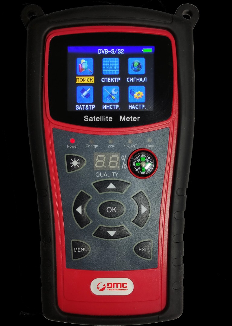 Устройство имеет дисплей диагональю 2,6 дюйма для отображения анализатора спектра. Меню достаточно простое, имеется перевод на русский язык. Подходит для настройки спутникового, эфирного и кабельного телевидения. На передней панели располагаются 8 кнопок для управления. Пять светодиодных лампочек отображают режимы работы, и имеется дополнительный экранчик для вывода значения качества сигнала. Частоты Sat на выходе от 950 до 2150, эфир 470-862 мегагерц. С его помощью можно настроить Триколор ТВ. НТВ плюс, МТС, Телекарта и любые спутники. Подача питания на конвертер возможна 13/18 вольт.