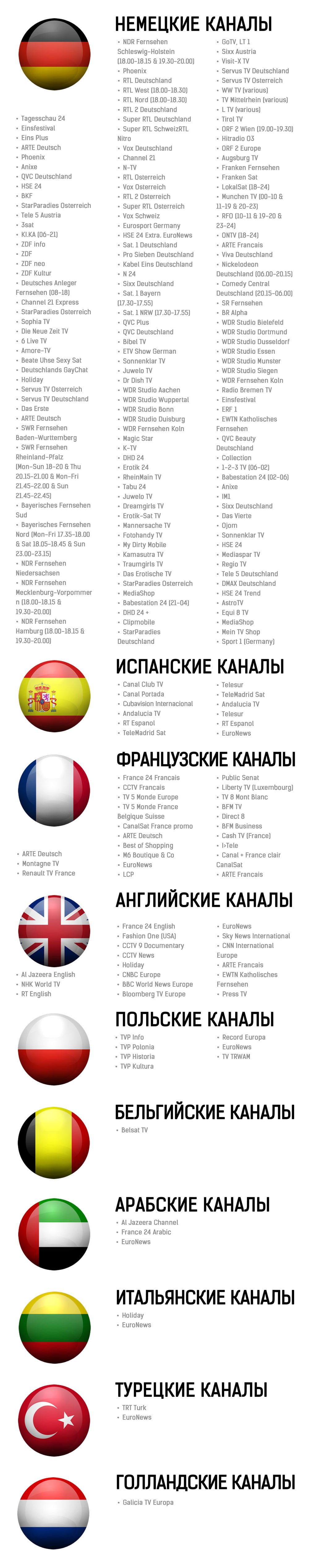 Данный спутниковый комплект телевидения будет незаменимым для тех кто хочет смотреть у себя на телевизоре спутниковые каналы на немецком, французском, испанском, английском, польском и других иностранных языках со всего мира.