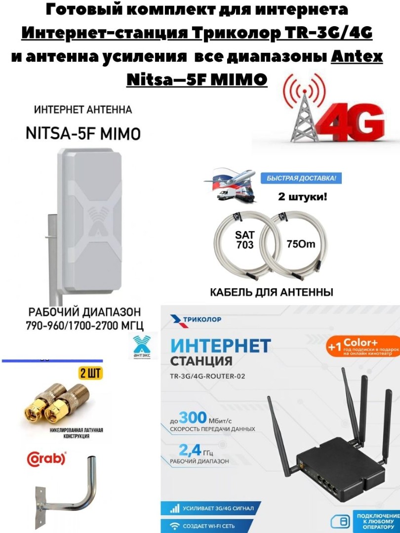 Интернет-станция Триколор TR-3G/4G-router-02 оснащена мощным передатчиком, который позволяет покрыть Wi-Fi сигналом площадь до 250 кв.м., со скоростью передачи данных до 300 Мбит/с. Станция полностью совместима с USB Wi-Fi адаптером Триколор TR-adapter-02.