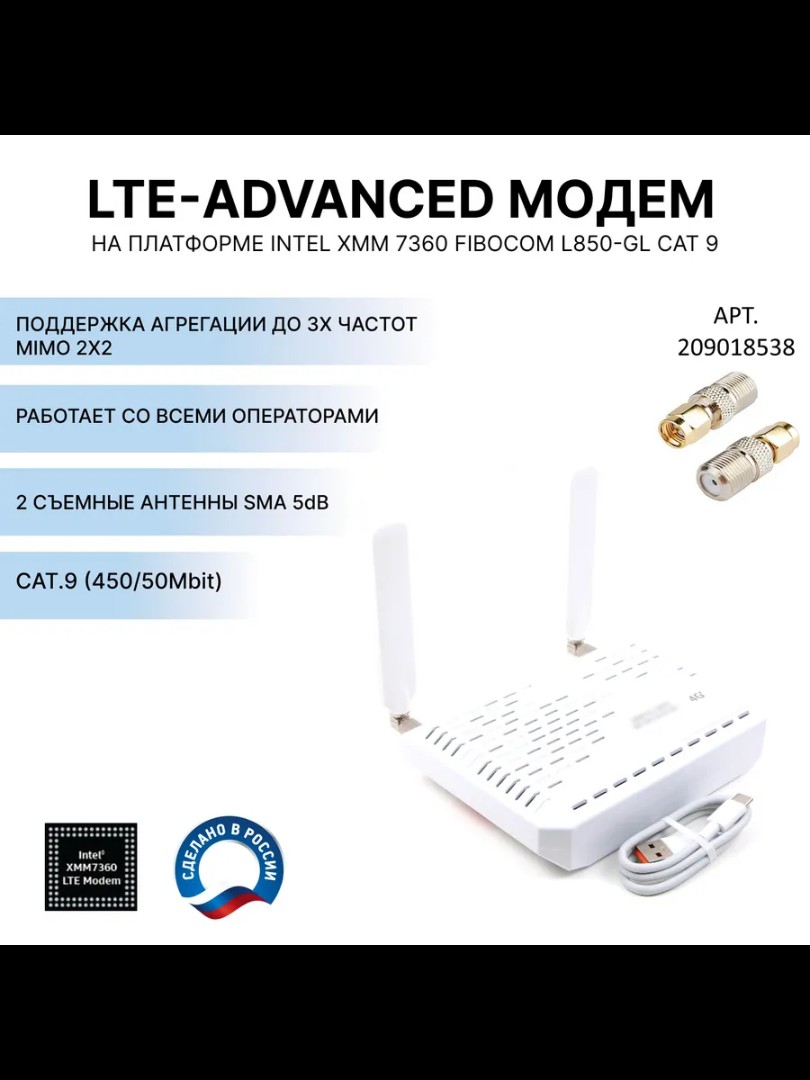 4G модем Fibocom L850-GL Cat.9, поддерживает агрегацию частот и MIMO 2x2. Скорость загрузки — до 450 Мбит/с.