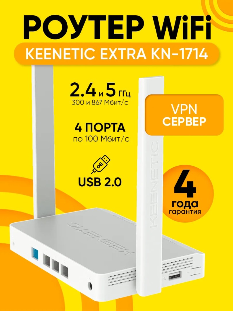 Wi-Fi роутер Keenetic Extra KN-1713 — двухдиапазонный (2.4/5 ГГц), поддержка до 1167 Мбит/с, 1xWAN, 3xLAN, 1xUSB. Обеспечивает стабильное беспроводное подключение.