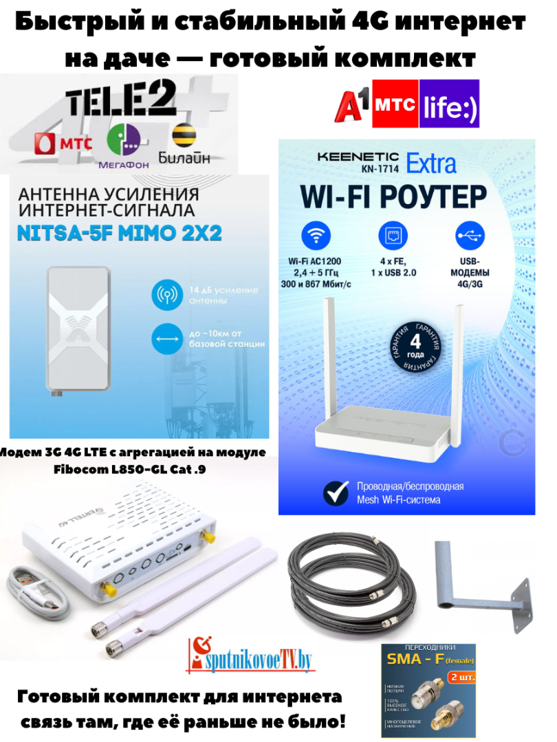 - 4G комплект, усиление интернета, модем Fibocom L850-GL, Keenetic Extra KN-1713, антенна Antex Nitsa-5, LTE Cat 9, агрегация частот, 4G антенна MIMO, интернет на дачу, усиление сигнала, роутер с модемом, стабильный интернет, комплект с антенной, быстрый 4G интернет, интернет для загородного дома, USB модем с SIM, MIMO 2x2, усиление LTE сигнала, Keenetic с модемом, готовое решение для интернета