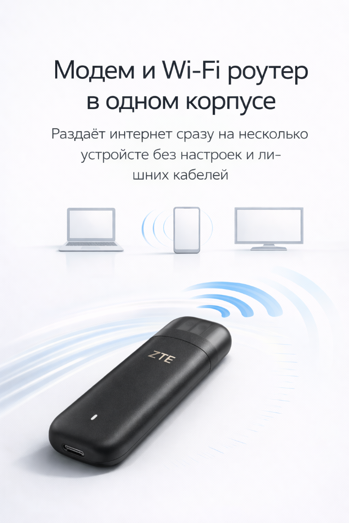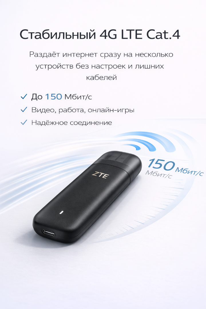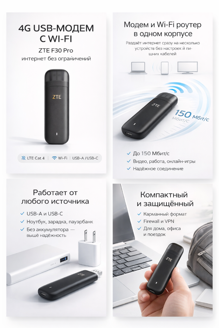 ZTE F30 Pro — универсальный USB-модем 4G с Wi-Fi, который обеспечит быстрый и стабильный интернет дома, в офисе, на даче или в путешествии.