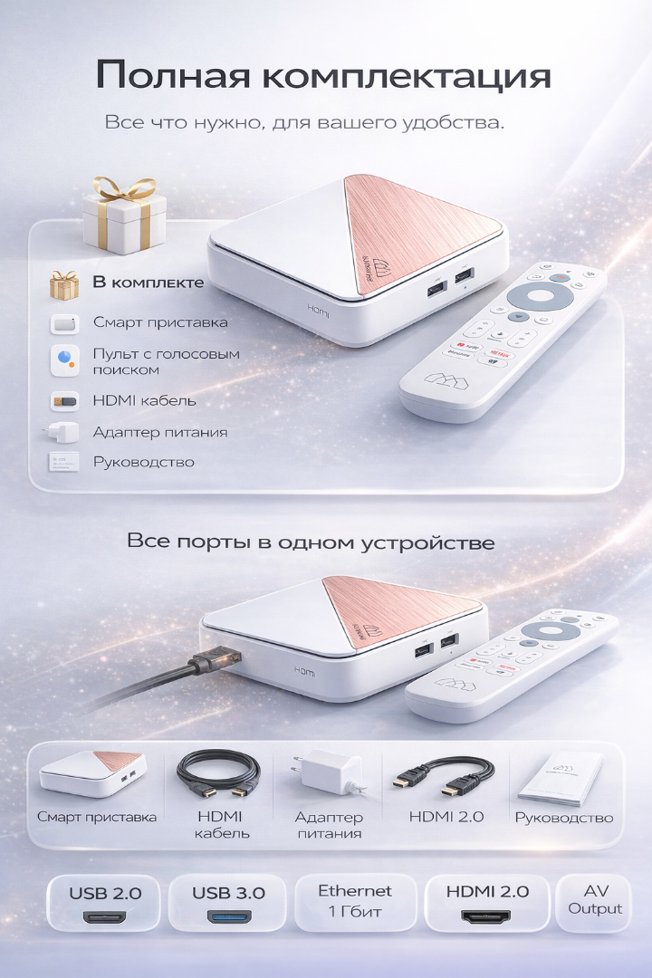 • Пульт дистанционного управления: В комплекте идет пульт, который удобно управляет приставкой, а также поддерживает голосовые команды и имеет кнопки быстрого доступа к основным сервисам.