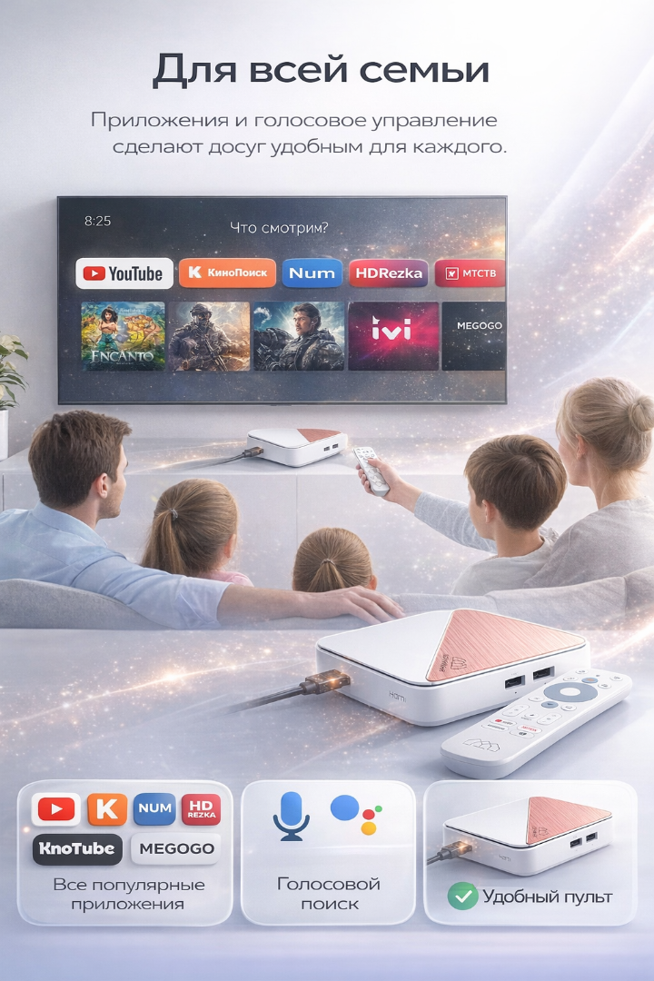 • Голосовое управление: Поддержка Google Assistant и Amazon Alexa, что позволяет управлять приставкой голосом. Вы можете включать и выключать телевизор, менять каналы, искать контент или управлять умными устройствами дома.
