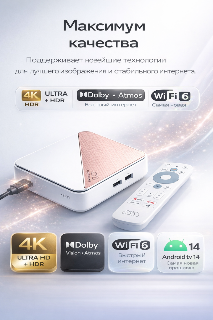 • Разрешение 4K (Ultra HD): Смарт приставка поддерживает воспроизведение контента в разрешении 4K (3840x2160 пикселей), что обеспечивает великолепное качество изображения с четкими деталями и яркими цветами. Погружайтесь в мир ультра-реалистичного контента, который оживляет каждую сцену.