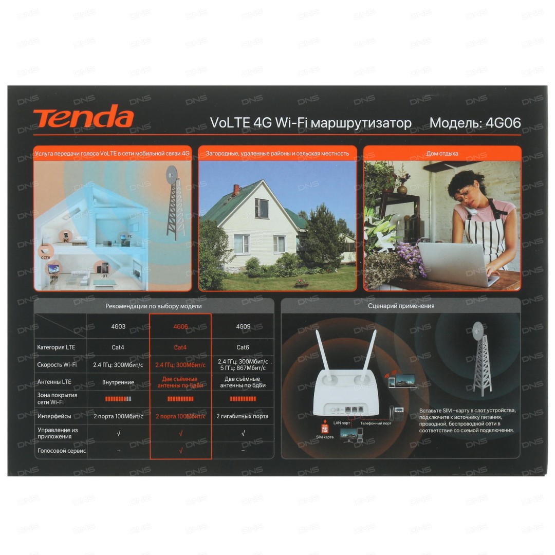 Самая доступная модель Tenda 4G06 - беспроводной маршрутизатор, который объединяет технологию LTE CAT4 и Ethernet, что обеспечивает высокоскоростной доступ к данным, а технологии VoLTE и CSFB позволяют пользоваться голосовыми услугами одновременно с доступом к Интернет.
