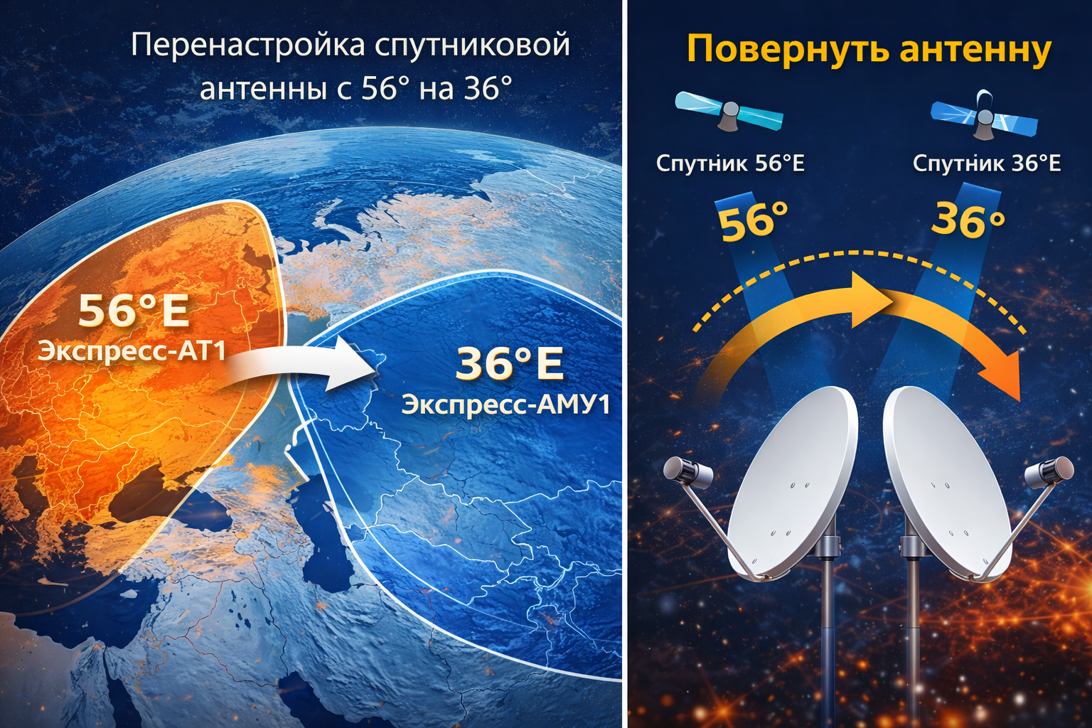 повернуть спутниковую антенну с 56° на 36° восточной долготы