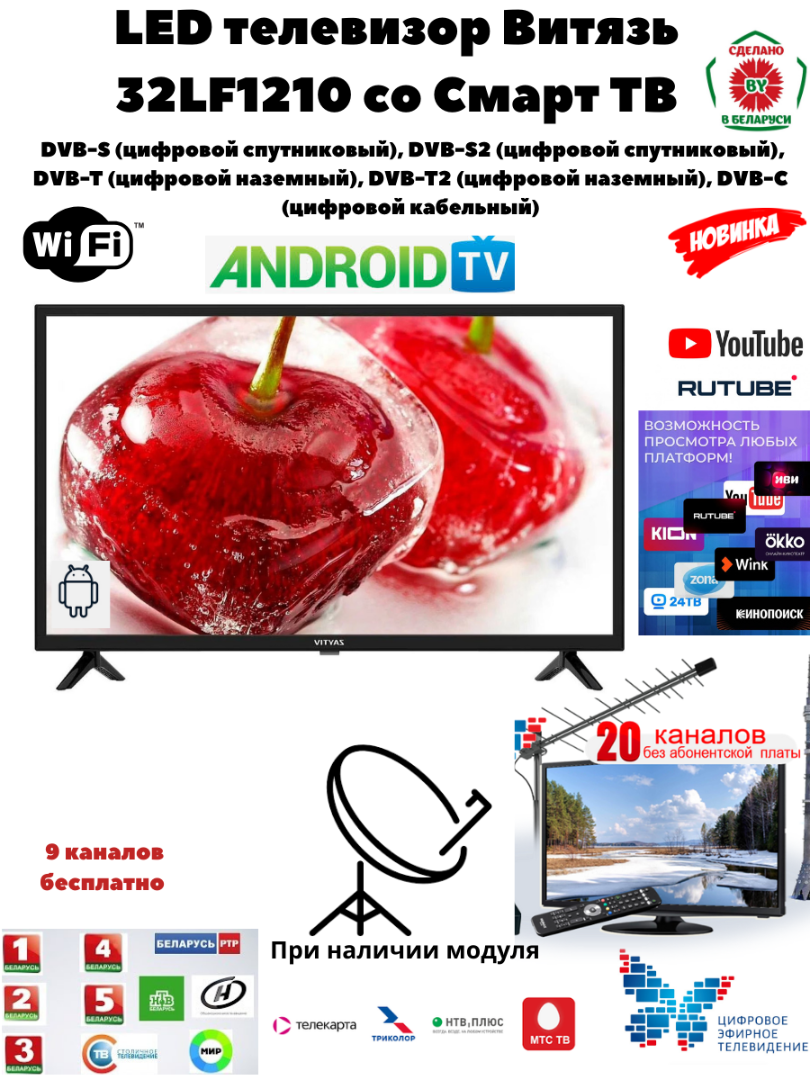 Мы предлагаем выгодные условия покупки белорусской техники с официальной гарантией. Вы можете заказать телевизор Витязь 32LF1224 с быстрой доставкой в Минск, Брест, Гродно, Гомель, Витебск, Могилев и любой другой населенный пункт Республики Беларусь.